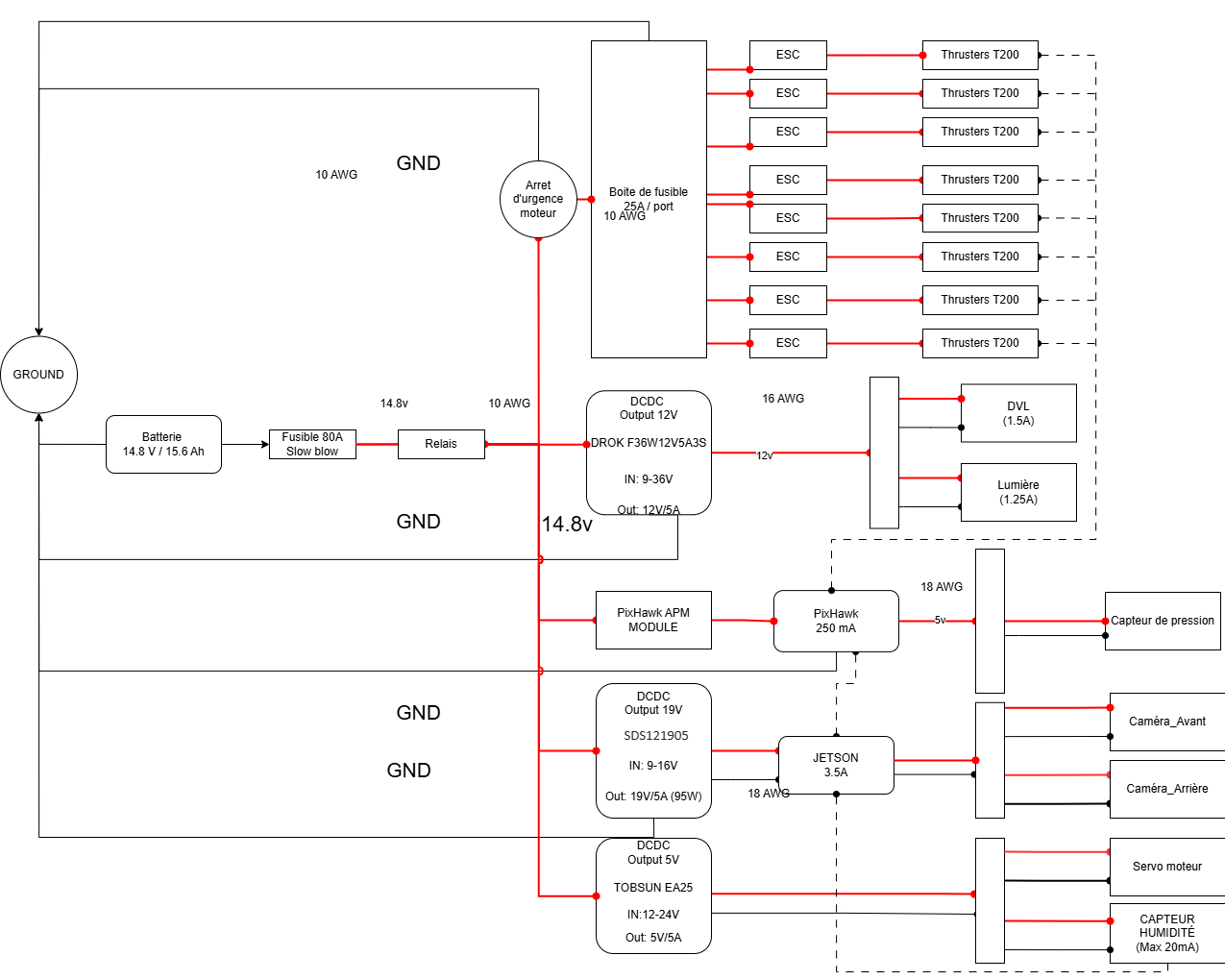 The electrical architecture is shown in the following diagram. There are three main power rails: